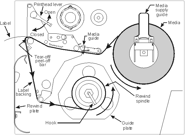 - 把标签回卷到标签回卷轴上然后卡上J状钩子,或把标签回卷在纸管芯上。
