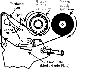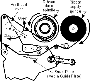 碳带应当如图1和图2所指示来安装。注意碳带在碳带供应轴上的展开方向是顺时针方向,且从Snap板上通过。在碳带被卷上碳带回收轴以前确认碳带回收轴外侧的放松帽是被锁定在正常位置。假如碳带被卷上碳带回收轴上时轴上的“鳍”处于完全缩进位置时会引起废碳带移除困难。